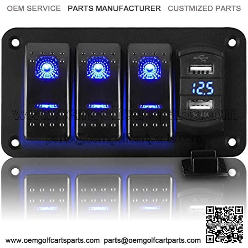 This dual USB rocker fast charger with voltmeter blue aluminum illuminated 3 gang rocker switches are not be signed, can be DIY-used to control any vehicle electrical appliance for your specific need. Sticker can remind you while using.