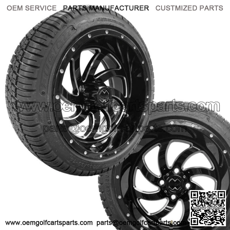 14″ Tempest Black/Machined Golf Cart Wheels on 205/30-14 (18″) Tires-Set of 4