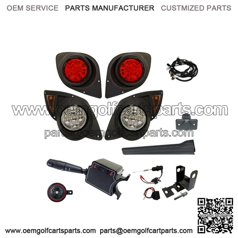 Factory Style LED Yamaha Drive Deluxe Street Package Light Kit. High quality and easy to install wiring harness. Super bright LED bulbs. Injected molded plastic bezels with tapered holes and stainless steel mounting hardware. 12V operation for gas or electric. Deluxe street package includes turn signal switch, horn kit, brake light switch, 12V outlet, steering column cover. Controls for horn, turn signals, lights and flashers are all located in the deluxe steering wheel control center.