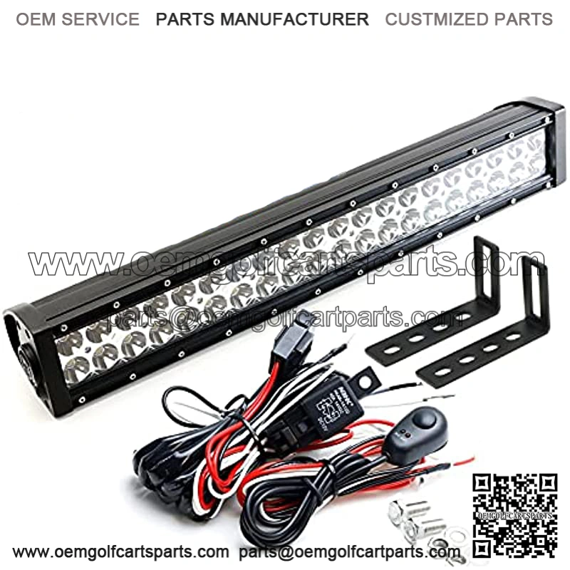 Complete LED light bar kit includes (1) 20-21″ xenon white 120W high power spot beam LED lightbar, (1) set of industry grade steel metal constructed lower grill opening area bracket mounts and (1) set of relay wire harness w/ in-line fuse and on/off switch