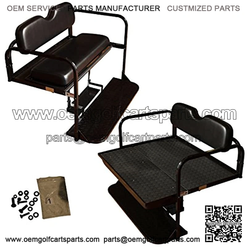 This seat kit makes a great addition to any golf cart converting your 2 passenger golf cart in to a 4 passenger golf cart. This seat kit includes the Flip Folding capability which allows the bottom seat cushion to flip over and converts the 4 passenger golf cart in to a very strong utility cargo bed featuring our HD Poly Deck for ultimate strength and versatility measuring 42W X 36D. We also include a grab strap to assist when flipping the seat from the closed 4 passenger design over to the cargo bed design. Seat Cushions: All seat cushions are marine grade and are factory matched colors. The back of the seat cushions have a polypropylene backing with pre tapped bolt holes for the seat cushions to mount to. Also with the NO Rot, NO Wood design and the use of polypropylene seat backing you no longer have rotting wood on the backs of the seat in a few years. Installation Details: This items will require 1.5 to 2 hours to complete the installation, however we do include very nice FULL COLOR installation instructions that are clearly labeled. All mounting hardware, bolts, and supports are included, this will make for an easier stress free installation – With this seat kit you will remove your factory basket behind the seat along with all of the brackets that connect the seat to the golf cart. This kit will replace the removed brackets and this kit will include new rear roof supports. – Technical support is always available by phone or email ready to answer any questions. – Estimated Installation Time is 1.5 to 2 Hours