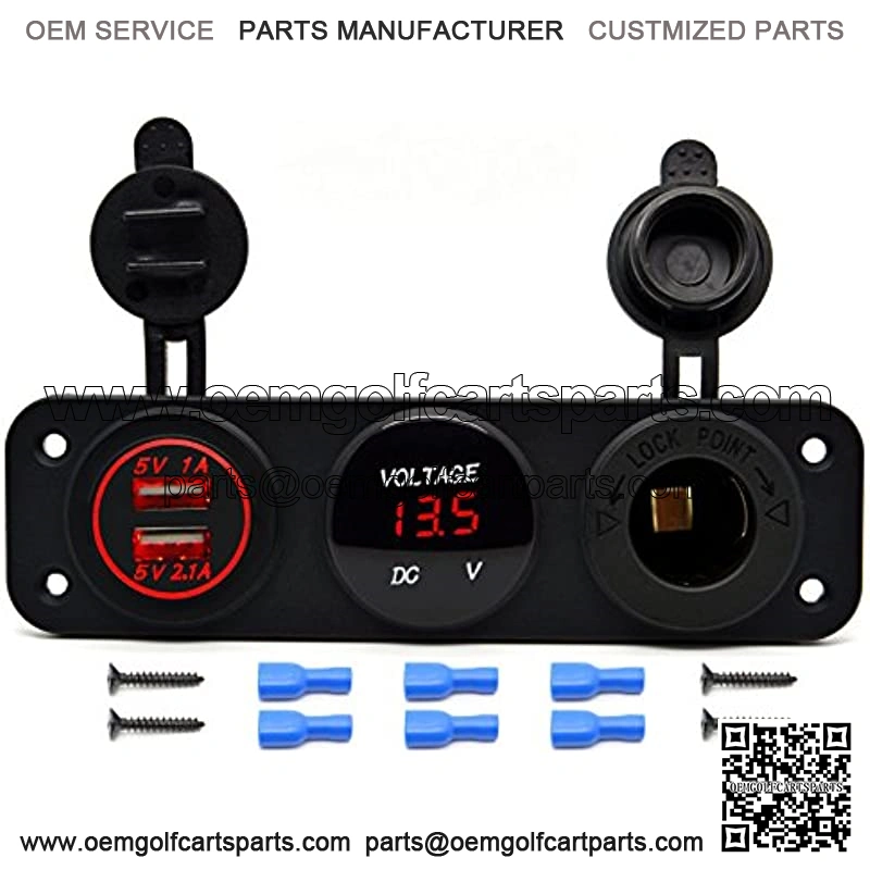 Package includes: 1x Cigarette Lighter Socket + 1x Red LED Voltmeter + 1x Red Dual USB Charger + 6 x Insulated Terminals + 4 x Screws