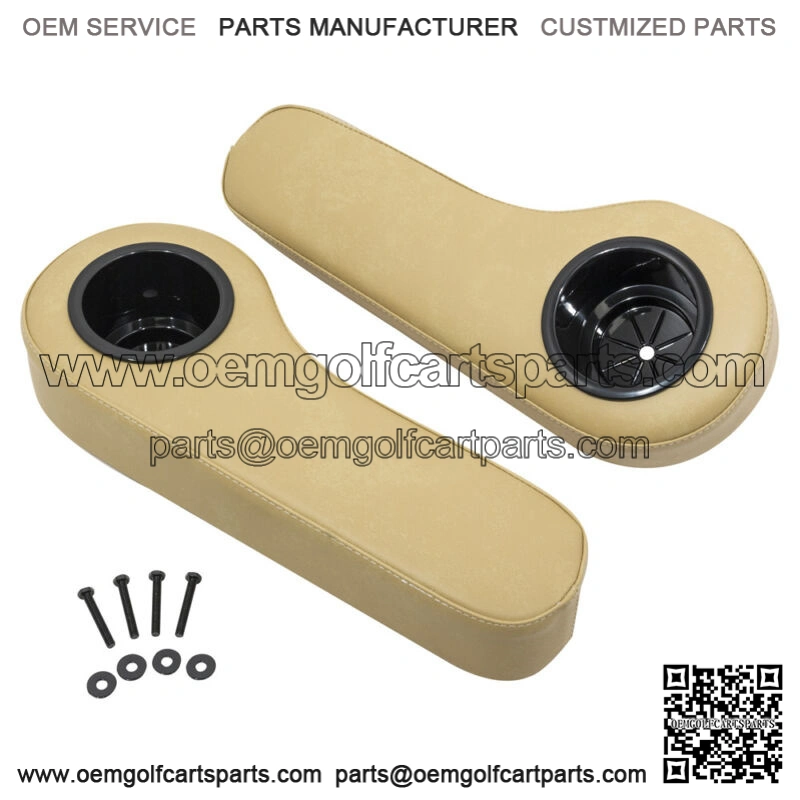 Tan rear seat arm-rest cushions with built in cup holder. Universal fit (set of 2). Includes bolts and drilling templates for easy installation and mounting to any metal rear seat. Installs in 10-15 Minutes.
